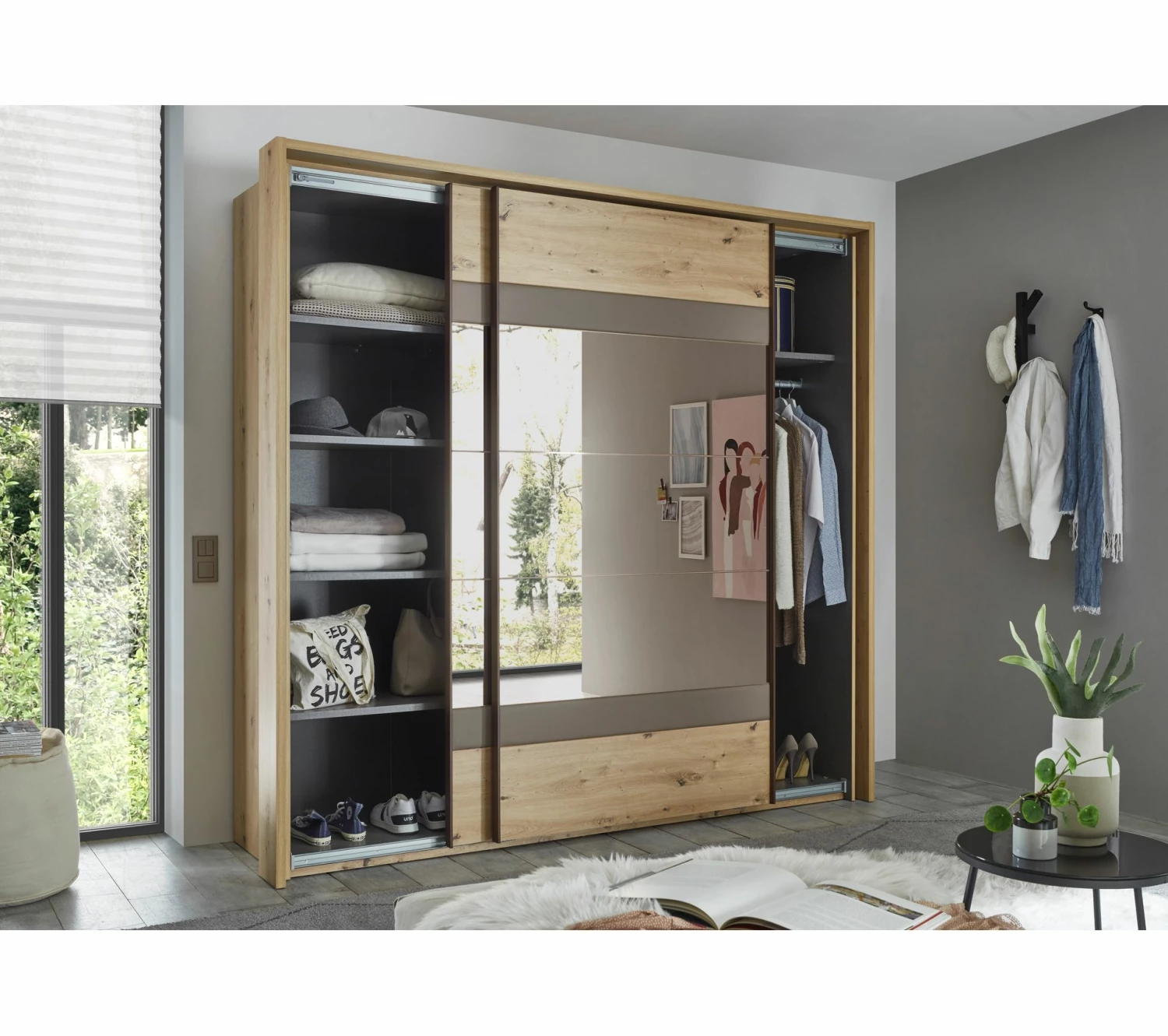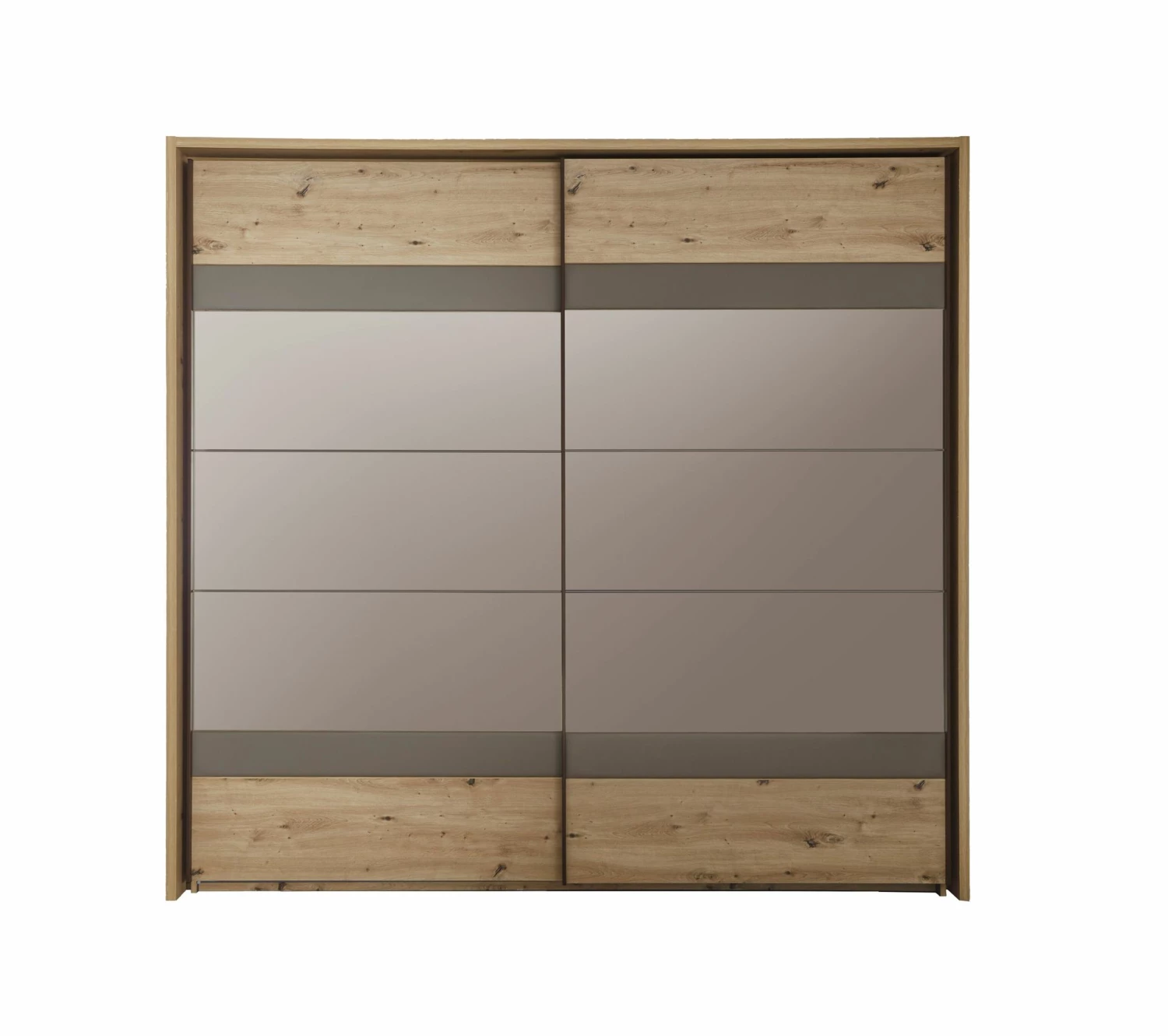 Un meuble fonctionnel et pratiqueCette armoire 2 portes coulissantes PRESTIGE vous permettra d’accueillir tous vos vêtements de manière organisée. Elle se dote d’espaces de rangement de dimensions et formats variés. Vos robes et chemises trouveront place dans la penderie. Cette armoire s’ouvre à l’aide de portes coulissantes : c’est très pratique pour gagner de la place dans votre chambre à coucher. Avec ses dimensions de L. 225 – H. 215 – P. 62 cm, cette armoire 2 portes conviendra pour une chambre d’adulte ou un dressing. Côté entretien, frottez ses surfaces à l’aide d’un chiffon sec et propre.Une armoire éléganteCette armoire 2 portes imitation chêne artisan agrandit la pièce grâce à son miroir teinté sur la façade avant. Pour une touche d’élégance supplémentaire, il se pare d’un effet maroquinerie. Le papier décor qui recouvre la structure de ce meuble imite naturellement le bois. Les poignées marron aspect rouillé ajoutent à son charme.