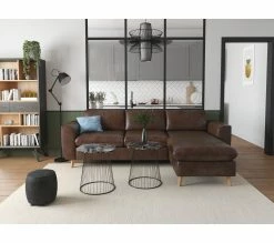 Angle à droite ou à gauche ? Au moment du montage de ce canapé d’angle convertible avec méridienne réversible, vous choisissez la meilleure configuration pour votre intérieur. Son système de tiroir sur roulettes vous permet de transformer ce canapé marron en lit d’appoint pour deux personnes. Il dispose d’un coffre de rangement sous sa méridienne.