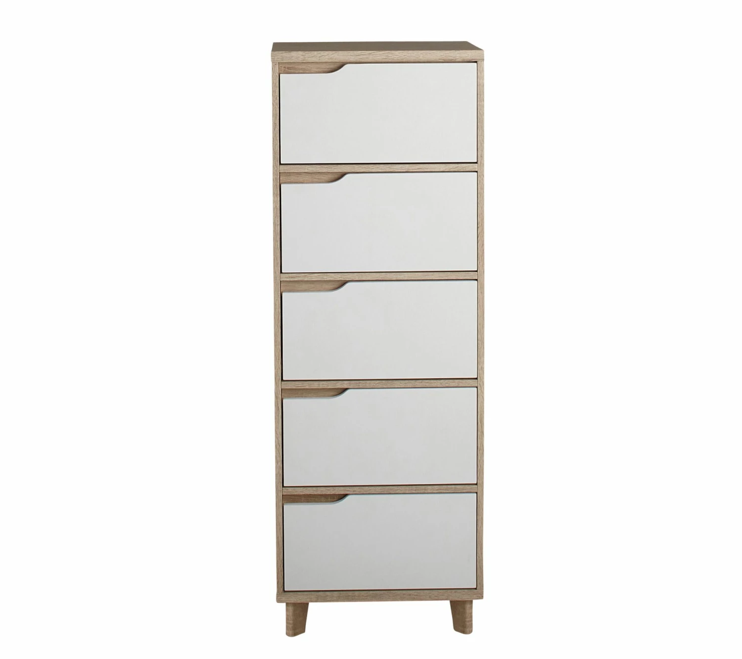 Ce chiffonnier imitation chêne et blanc est proposé dans un style scandinave dans l’air du temps. Ses deux coloris permettent de l’associer à tout type de mobilier de chambre, qu’il soit blanc, de couleur chêne ou les deux pour une harmonie parfaite. Confectionné en panneaux alvéolaires, ce chiffonnier est rehaussé de pieds légèrement inclinés.