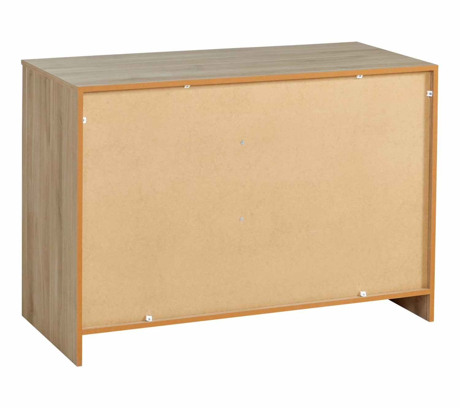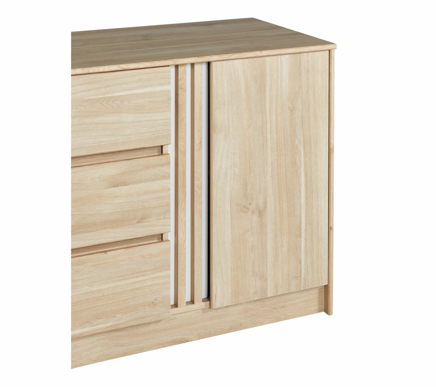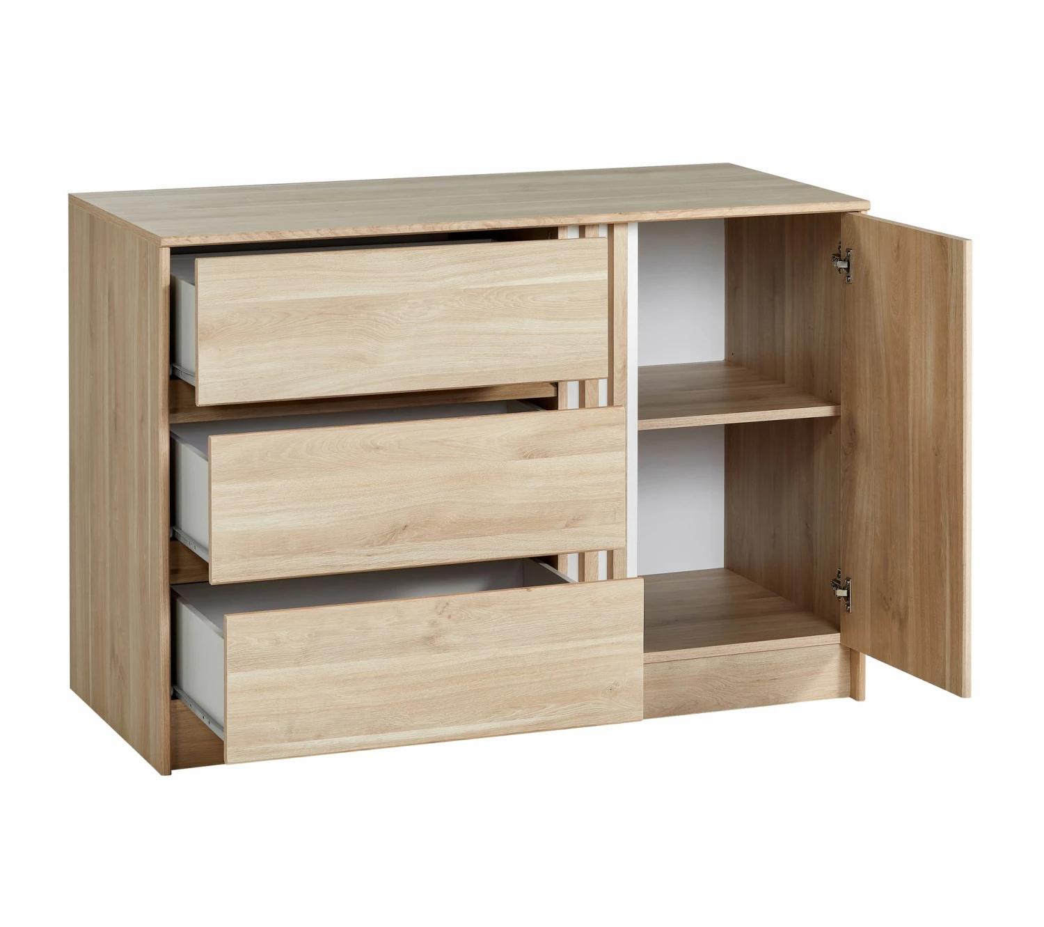 Pour un rangement facileParfait complément de l’armoire coordonnée, la commode ESCALE vous assure un rangement facile et fonctionnel. Dotée de trois tiroirs et de deux niches de rangement dissimulées derrière une porte battante, elle est conçue pour accueillir vos vêtements et accessoires avec organisation. Cette commode de L. 109,8 x H. 76,8 x P. 50 cm, fabriquée en France, possède une structure en panneaux de particules pour une solidité dans le temps. Vous ne manquerez pas d’apprécier sa simplicité d’entretien : contentez-vous d’un dépoussiérage régulier à l’aide d’un chiffon doux légèrement humide.L’élégance de la simplicitéSes tons chaleureux et ses lignes sobres font de cette commode imitation chêne un meuble idéal dans un aménagement de style nordique. Idéalement accordée aux différentes pièces de la collection, cette commode saura tout aussi bien se marier à un aménagement blanc laqué et des décorations naturelles.