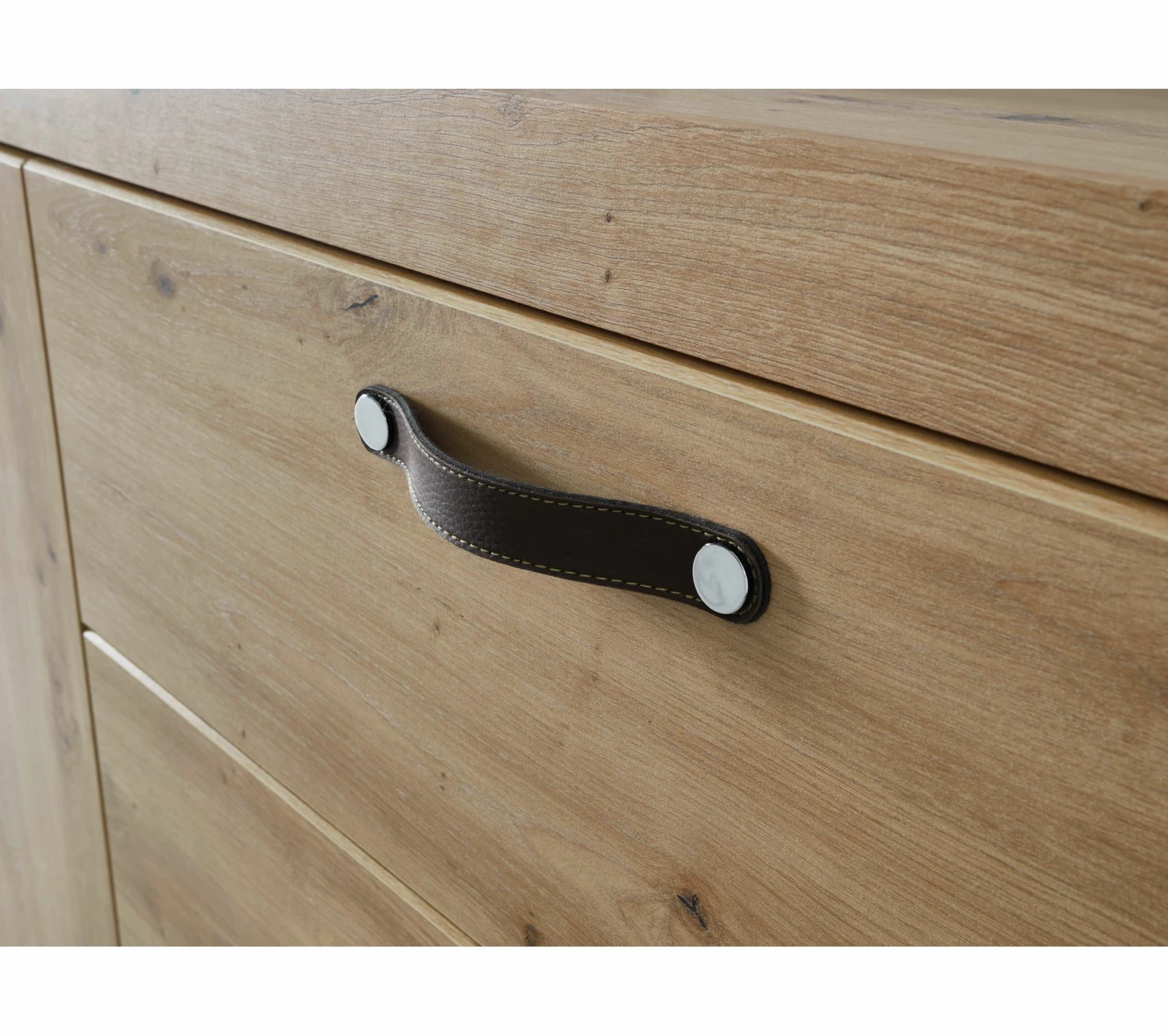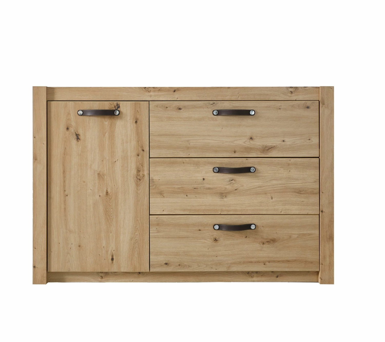 Une commode d’une grande capacitéIdéale pour meubler avec élégance une chambre parentale, cette commode 3 tiroirs 1 porte PRESTIGE de la marque LINEA NATURA offre une grande capacité de rangement. Elle se caractérise par ses vastes tiroirs et sa porte dissimulant un espace avec une étagère où disposer facilement le linge plié ou les accessoires. Cette commode de dimensions L. 133 x H. 87 x P. 41 cm présente une structure en panneaux de particules avec un papier décor imitation chêne artisan et un piètement qui la surélève. Le détail que l’on aime : les poignées 100 % polyuréthane avec un piquage en point sellier.Une commode éléganteCette commode imitation chêne artisan convient à de nombreux styles de décoration. Les poignées des tiroirs évoquent le travail artisanal et la maroquinerie de luxe. La teinte boisée et son design font de cette commode 3 tiroirs 1 porte un meuble intemporel, qu’elle soit placée dans une chambre ou même une pièce de vie.