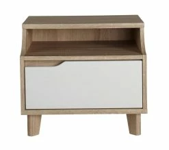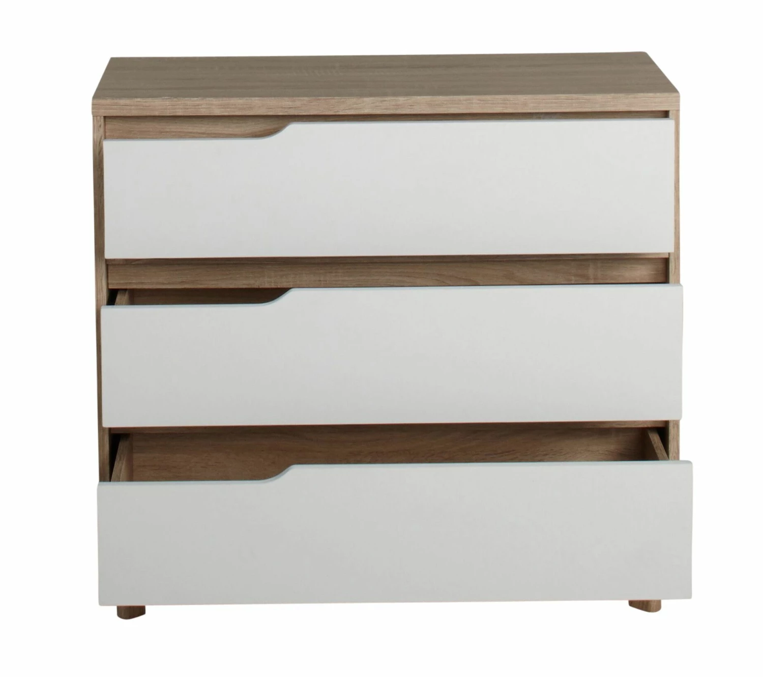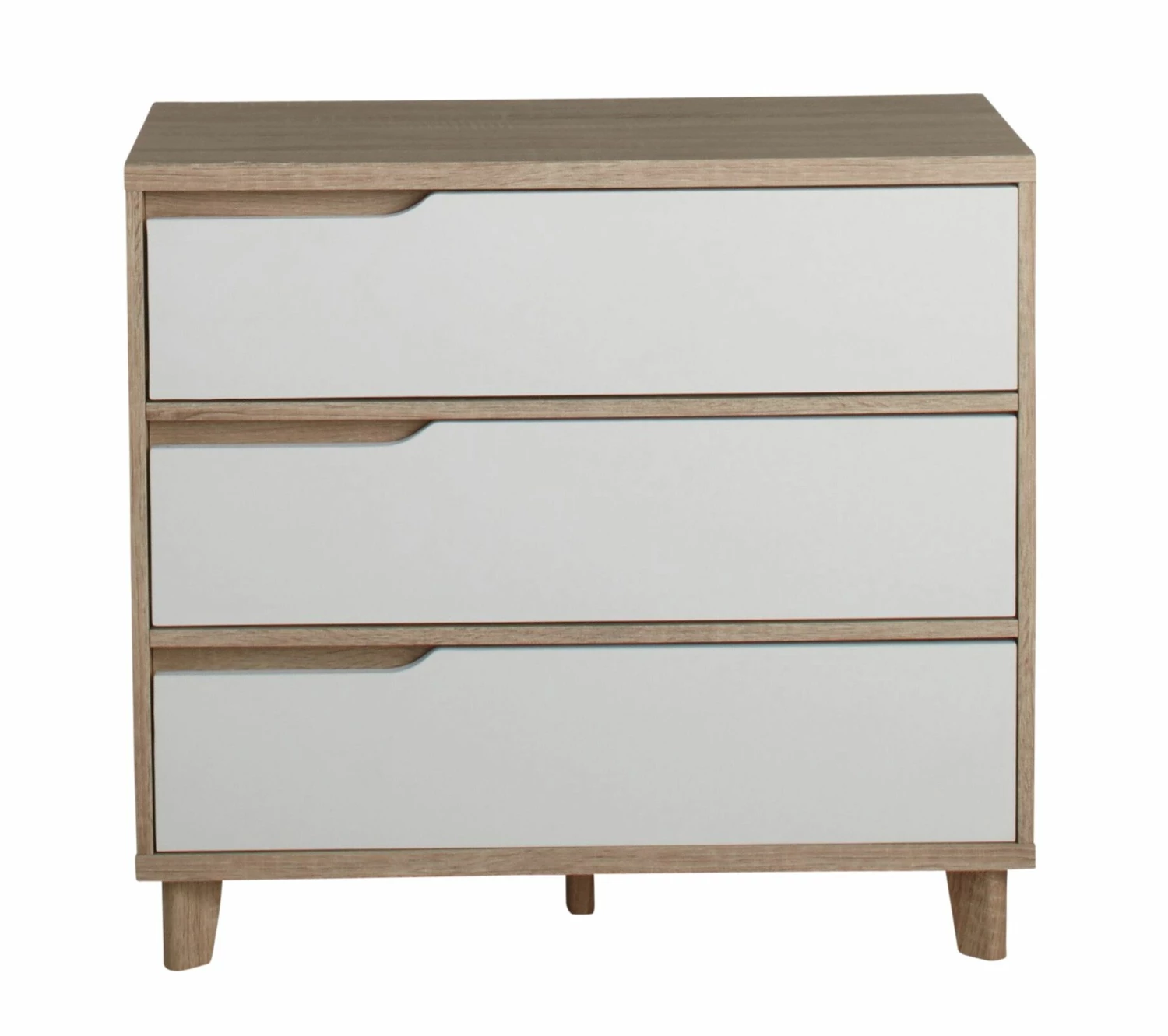 Vous aimez le contraste des matières et des couleurs ? Optez pour cette commode imitation chêne et blanc d’inspiration nordique. Son design est sobre et compact. Les 4 pieds obliques donnent une charmante touche vintage. Cette commode 3 tiroirs se marie à merveille avec du mobilier blanc ou en bois clair.