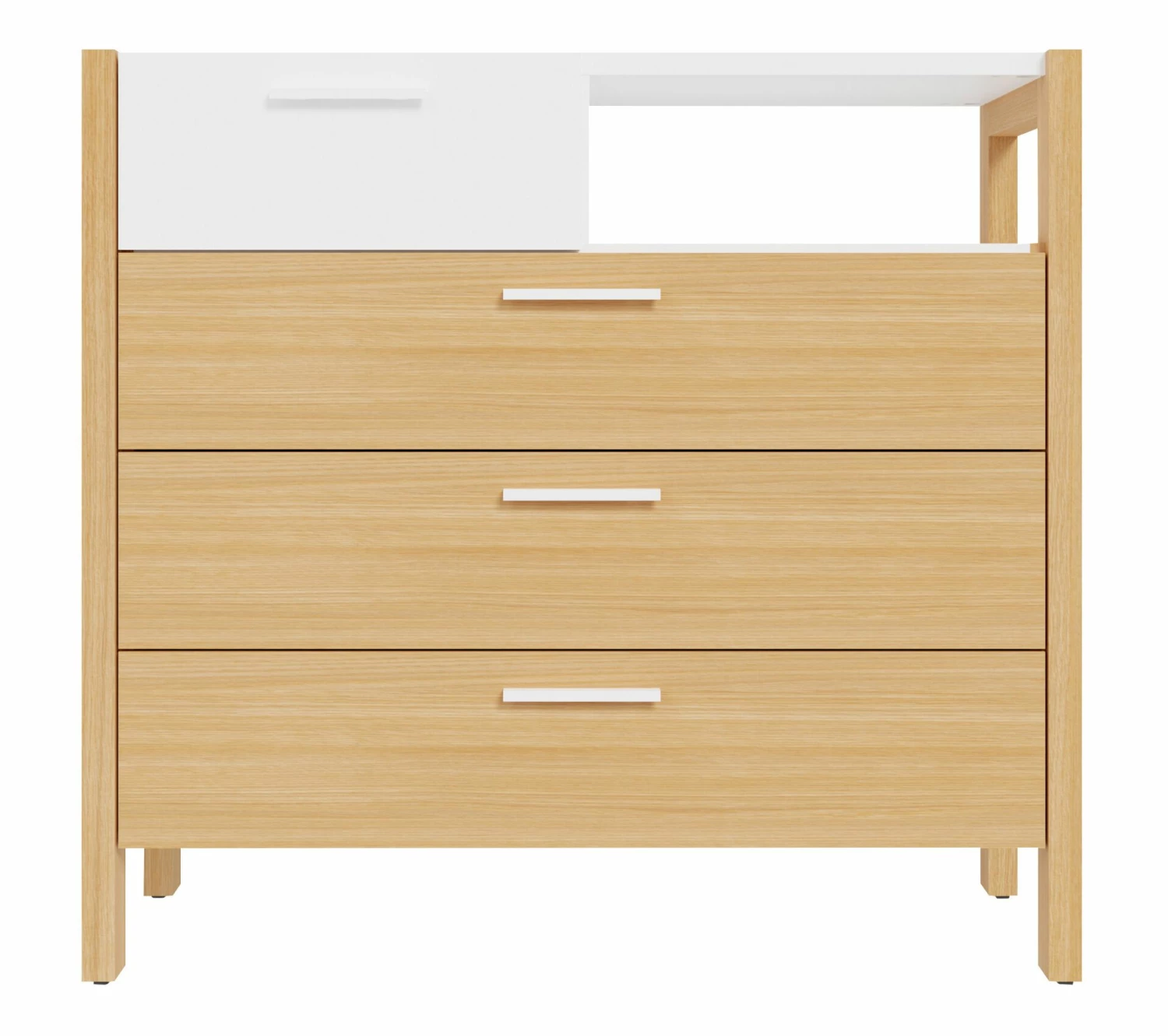 Fabriquée en Europe, cette commode OMBRONE est aussi spacieuse qu’elle est durable. Des 4 tiroirs de cette commode de 41,2 cm de profondeur, 3 s’étendent sur toute sa largeur tandis que le quatrième côtoie une niche ouverte. De quoi ranger tout votre linge et vos accessoires ! La commode pourra être placée aussi bien dans une salle de bains que dans une chambre, selon vos besoins. Réalisée en panneaux de particules recouverts de papier décor, elle est facile à entretenir et ne craint pas l’humidité. Vous pourrez la dépoussiérer avec un chiffon doux.