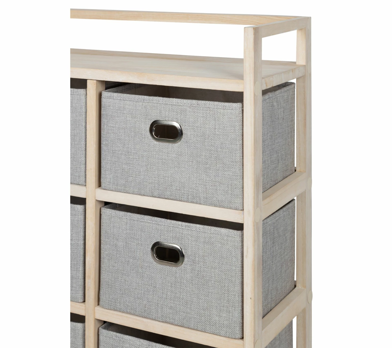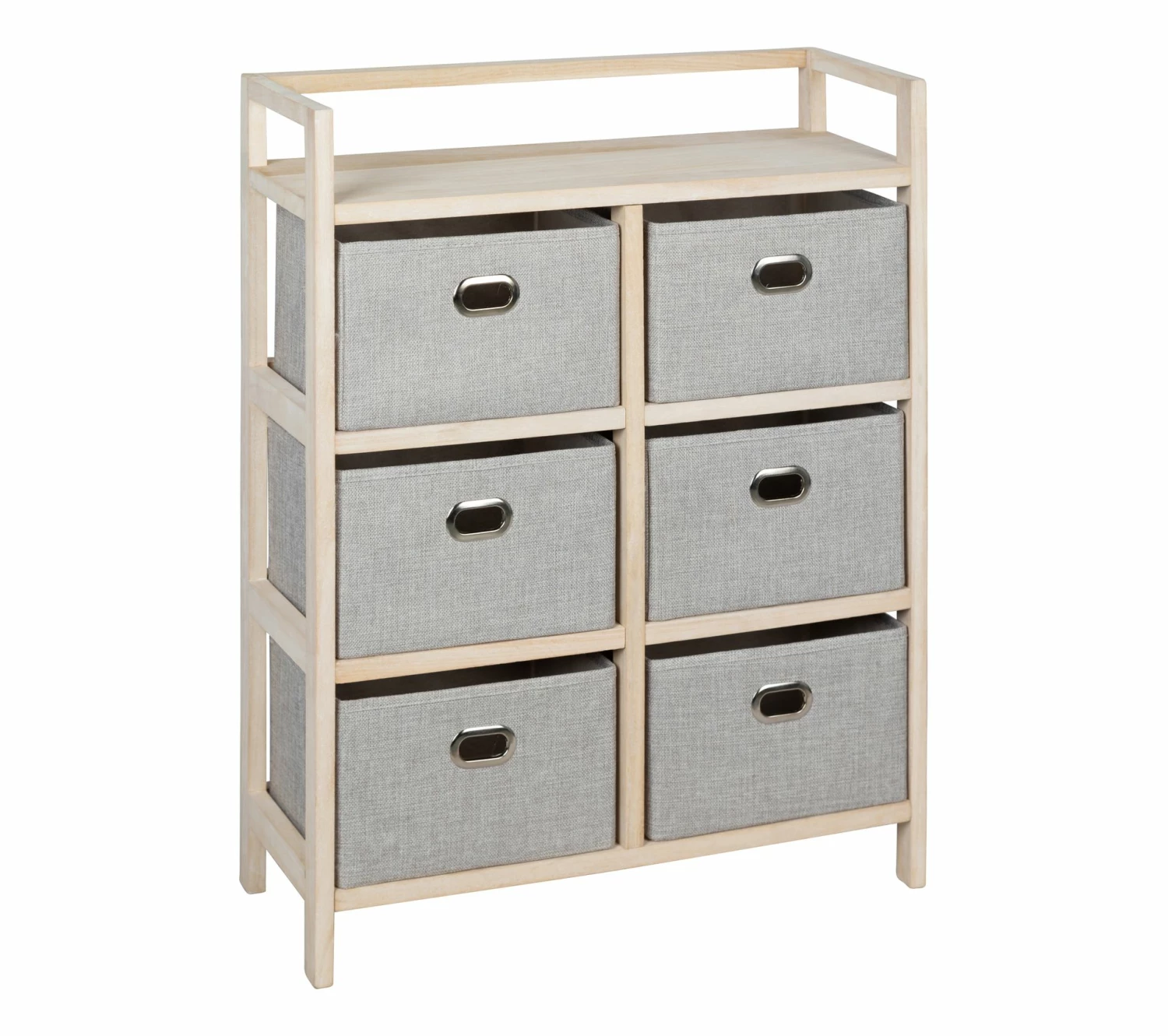 - Structure Meuble d’appoint 6 tiroirs en paulownia, tiroirs en tissu effet lin.