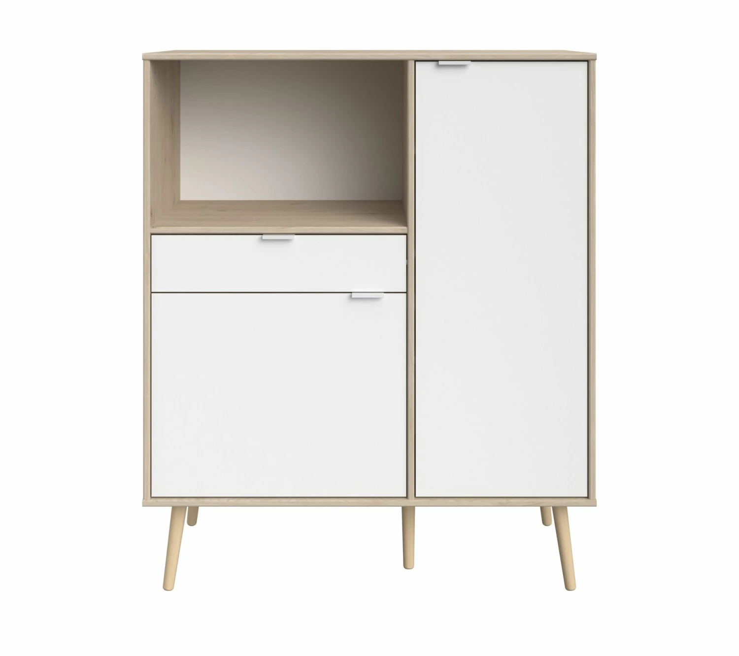 Cette desserte aux coloris chêne et blanc est idéale pour faire voyager votre cuisine jusqu’en Scandinavie. Elle s’assortit aisément à d’autres éléments dans les mêmes coloris clairs. Si vous appréciez ce style, complétez votre desserte Olga par d’autres meubles de la même collection, comme le buffet avec crédence ou le rangement à une porte.