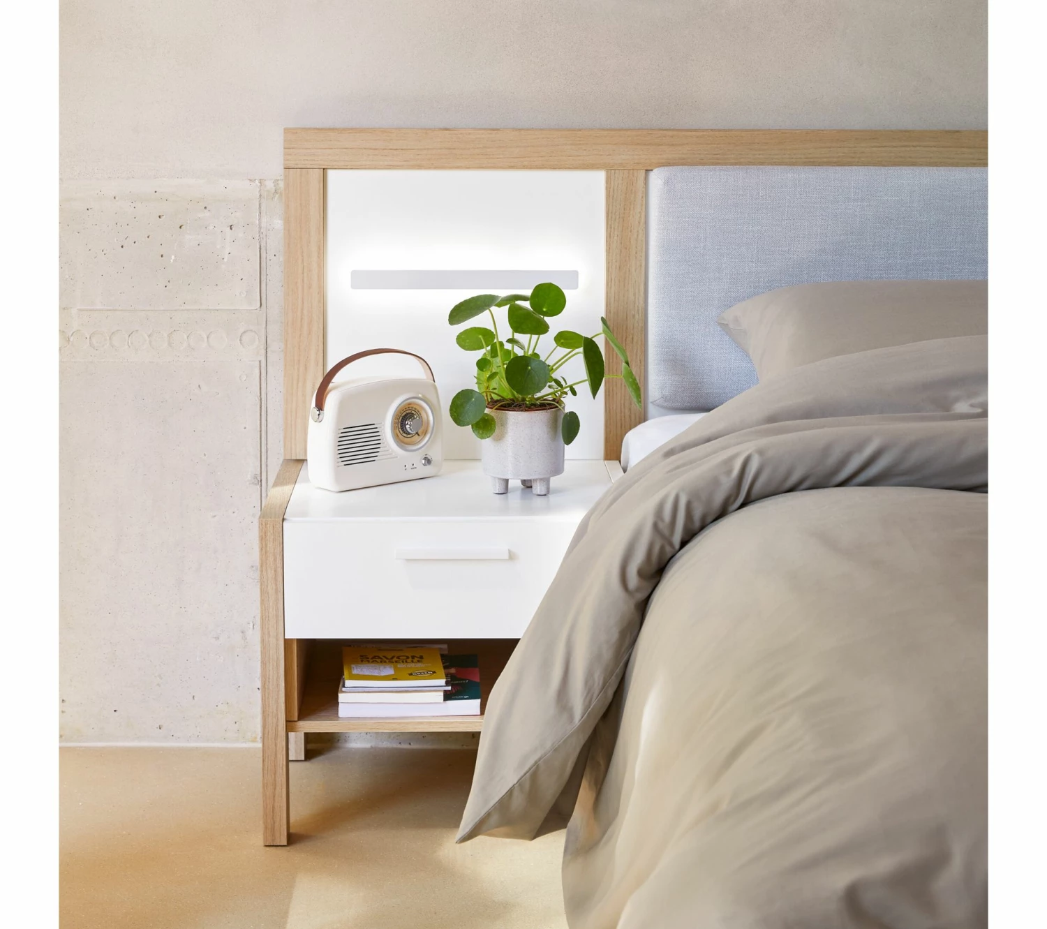 - Tête de lit avec rembourrage en tissu.