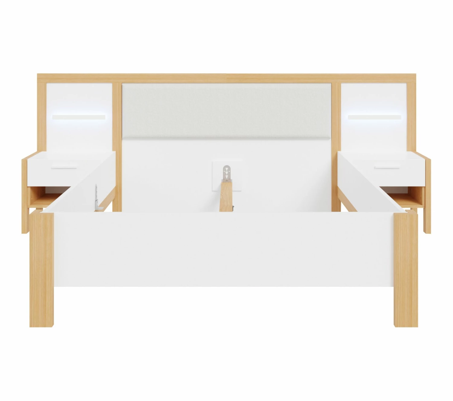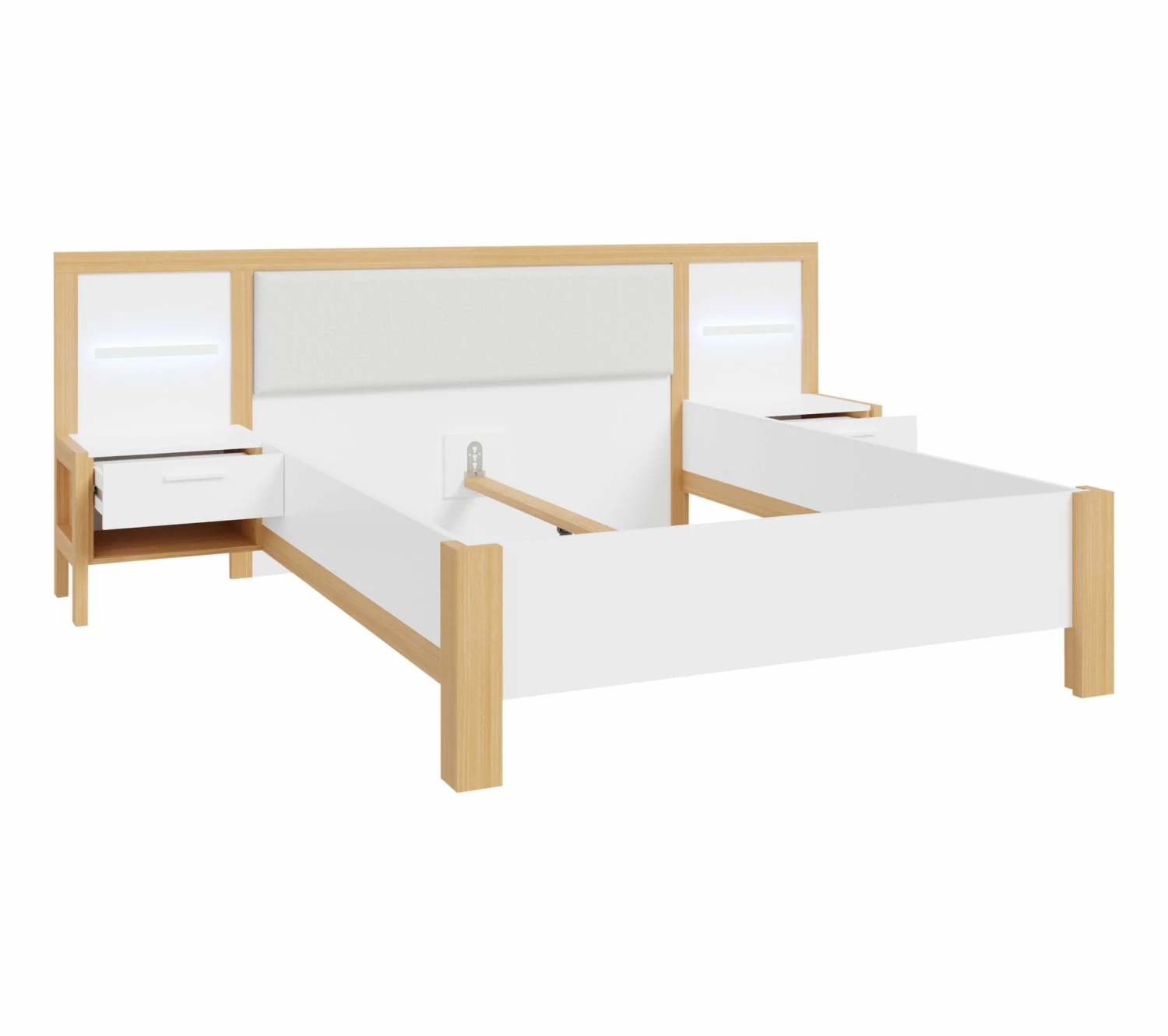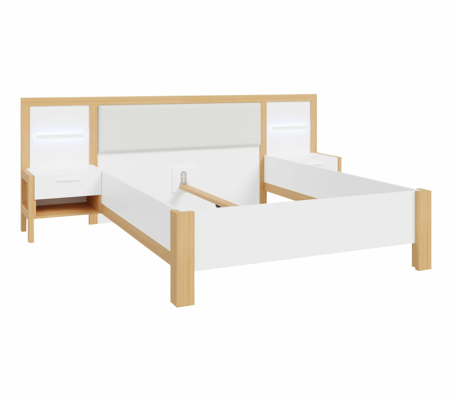 - Structure en panneaux de particules revêtus de papier décor blanc et imitation chêne. Chevets et LED intégrés.
