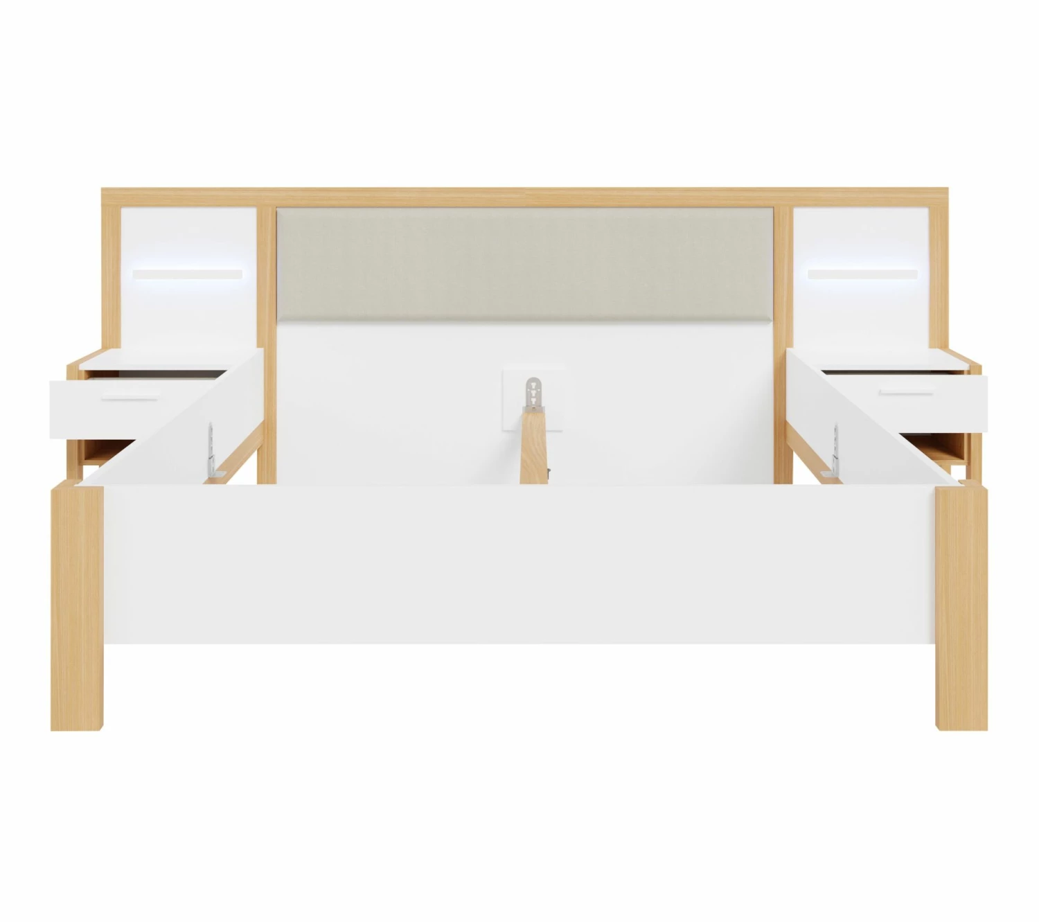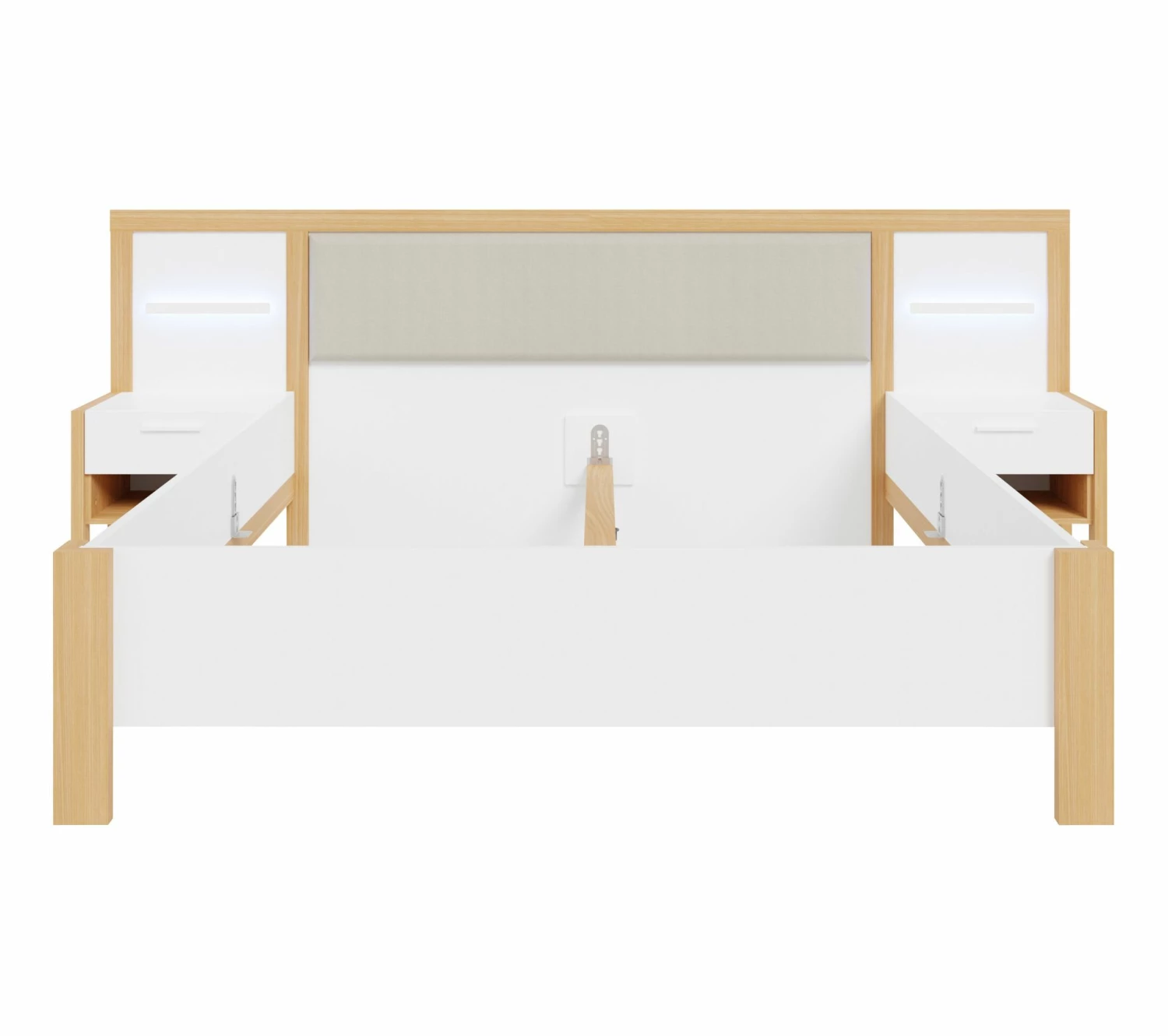 - Structure en panneaux de particules revêtus de papier décor blanc et imitation chêne. Chevets et LED intégrés.