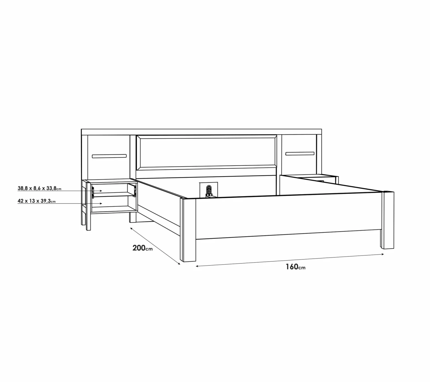 - Couchage en cm 160×200 cm (sans matelas, sans sommier).
