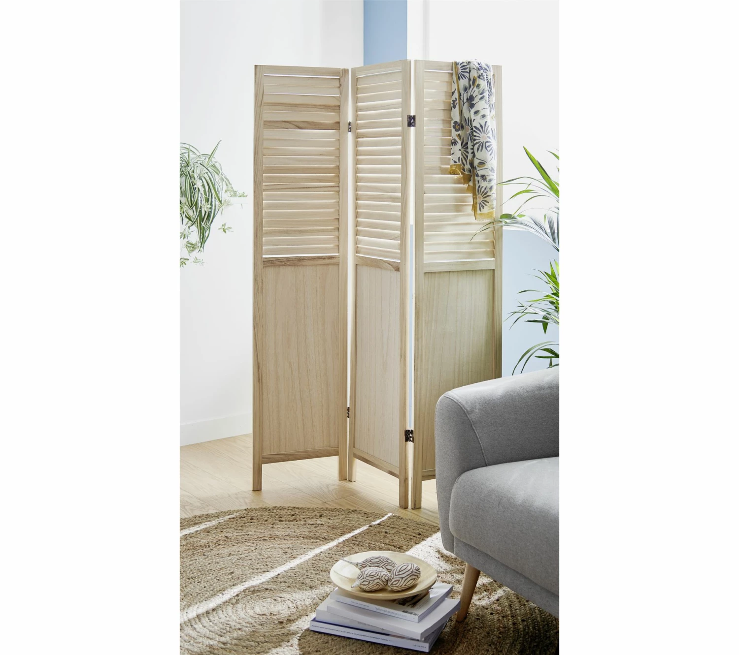 Grâce à son design figurant des panneaux de bois surmontés de persiennes, ce paravent de dimensions L. 120 x H. 170 cm crée un sentiment d’ouverture… en même temps qu’il sert de cloison entre deux espaces. Clair et lumineux, son coloris naturel est assorti aux décors modernes, champêtres ou d’inspiration scandinave.