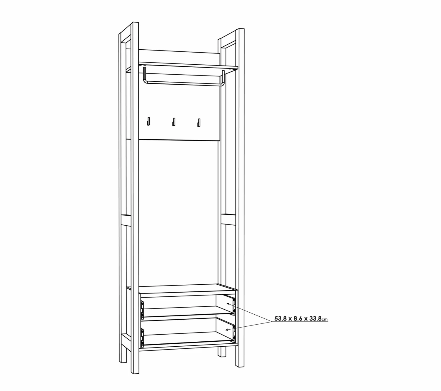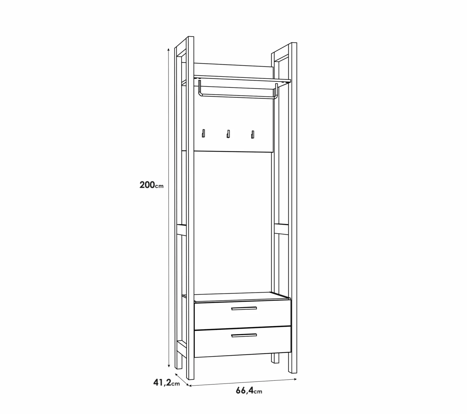 Cette penderie L. 67,2 x H. 200,1 x P. 54,5 cm est un élément qui prend peu de place et rend de grands services. Ce meuble affiche une belle hauteur tout en occupant un espace restreint au sol. Dans sa partie haute, il se dote d’une étagère où vous posez quelques pulls pliés. Juste au-dessous se trouve la tringle, où vous pouvez suspendre robes longues, costumes et manteaux. Cette penderie ouverte possède aussi un bloc de rangement comportant deux tiroirs dans sa partie basse où vous pouvez placer des accessoires. Construite en panneaux de particules, elle présente une structure robuste.