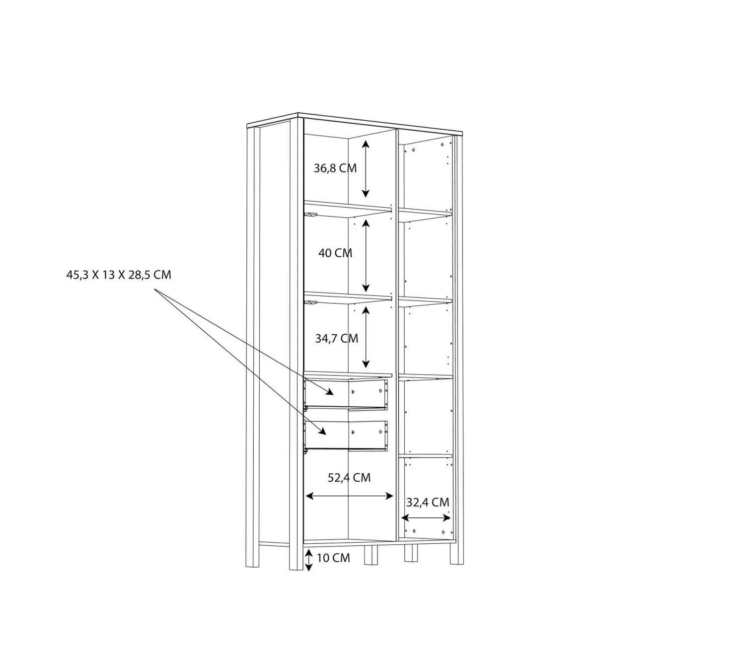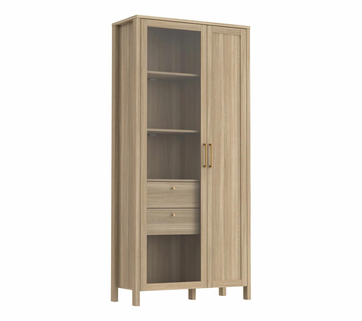 Fabriquée en Union européenne, la vitrine LEONITA est un meuble de qualité qui vous permettra de multiplier les espaces de rangement dans votre pièce à vivre. Elle dispose de 9 étagères pouvant accueillir des objets de différentes sortes et de 2 tiroirs fermés. Cette vitrine de L.96,5 – H.206,2 – P.41,4 cm se referme grâce à 2 portes, une vitrée et une pleine, dotées d’un système soft close qui assure une fermeture tout en douceur. Réalisée en panneaux de particules habillés de papier décor, cette vitrinepeut être dépoussiérée avec un chiffon en microfibre doux. Le verre se nettoie quant à lui avec du produit à vitres.