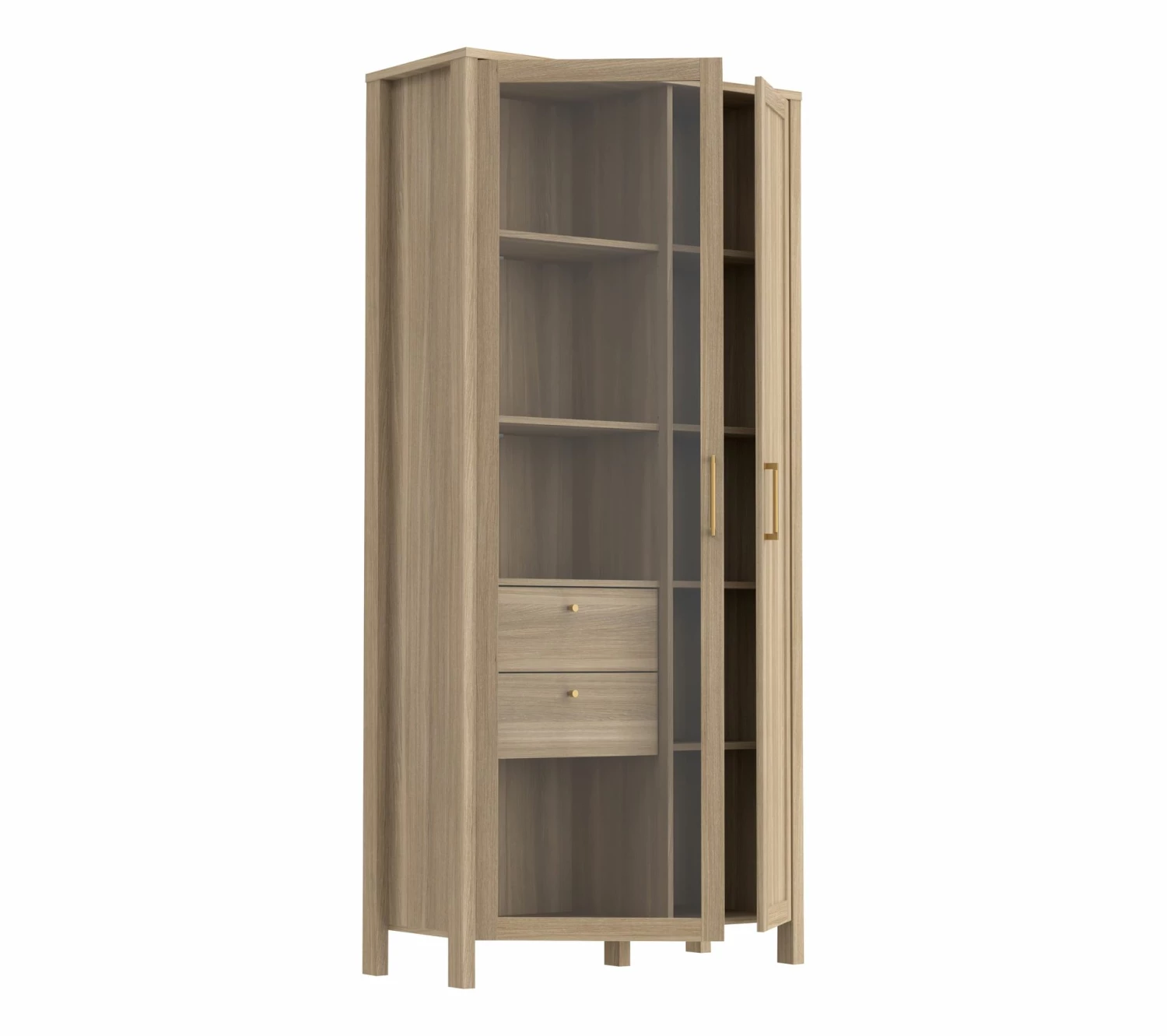 Cette vitrine imitation chêne vous charmera par son aspect élégant et classique. Son atout charme ? Ses poignées des portes et ses tiroirs réalisées en laiton brossé. Pour une décoration coordonnée, vous pouvez associer ce meuble à la table basse ou au buffet de la même collection.